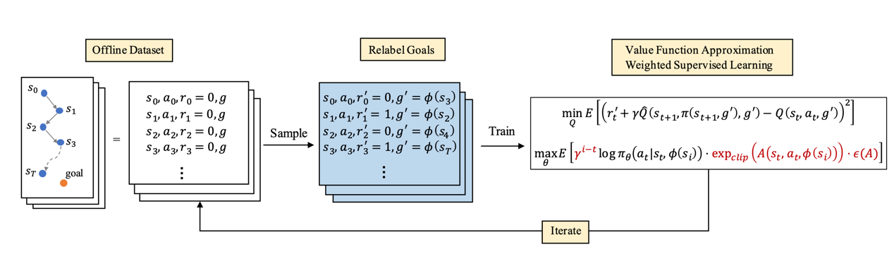 通常强化学习方法需要大量的在线采样进行策略学习,然而在许多真实场景中,在线采样数据十分昂贵且危险,因此对于离线数据集的利用具有十分重要的意义。本文主要研究完全离线条件下的多目标强化学习问题,即利用固定的离线数据集学习一个可以泛化到整个目标空间的策略。作者利用目标引导监督学习(GCSL)方法简单和稳定的性质,并将其推广到完全离线强化学习的设定下,提出了一种十分有效且具有理论基础的方法,即“重要性加权的目标引导监督学习”,简记作WGCSL。