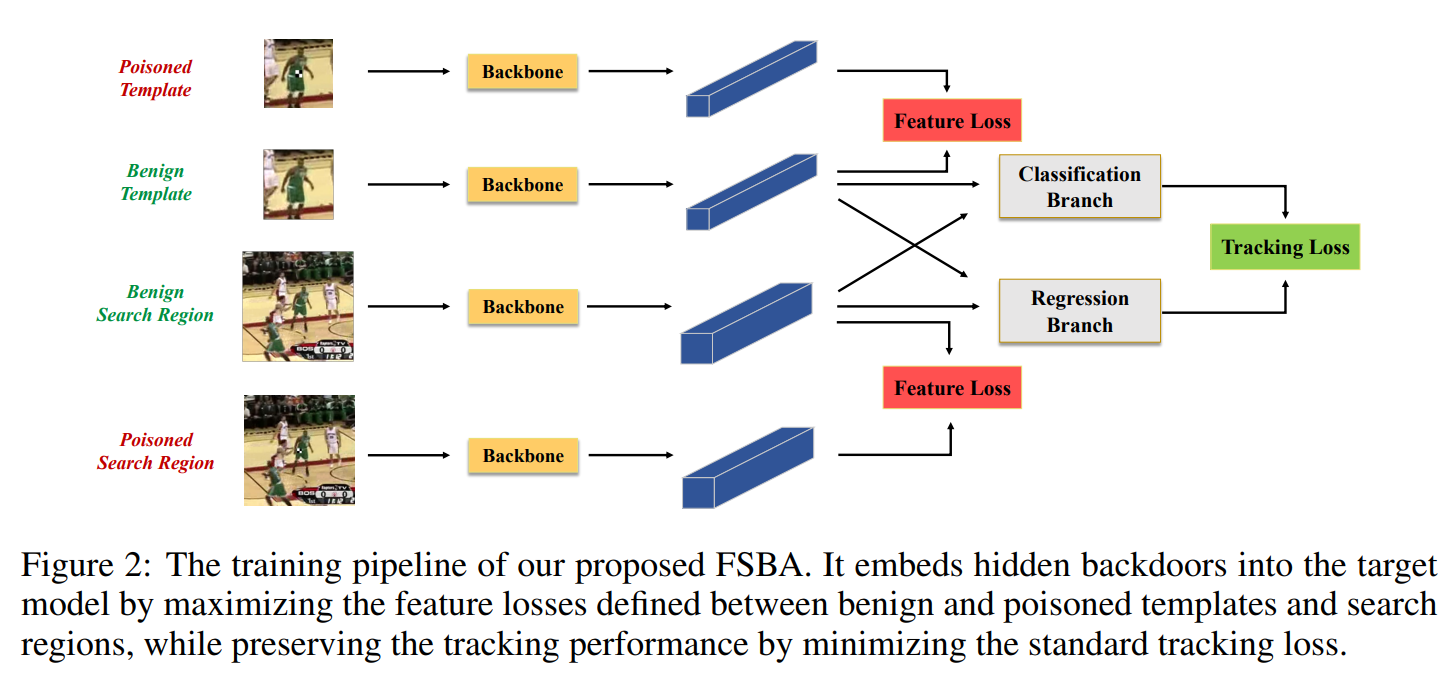 现有的后门攻击大多数是针对图像分类任务设计的有目标攻击,顾名思义,后门攻击旨在训练过程中通过某种方式给被攻击模型植入后门(backdoor),攻击者可以通过预先设定的特定触发器(trigger)激活后门,在后门未被激活时,被攻击的模型具有和正常模型类似的表现,而当模型中埋藏的后门被攻击者指定的触发器激活时,模型的输出变为攻击者预先指定的标签(target label),以达到攻击者的恶意目的。后门攻击可以发生在训练过程非完全受控的很多场景中,例如使用第三方数据集、使用第三方平台进行训练、直接调用第三方模型,因此对模型的安全性造成了巨大威胁。本文揭示了目标跟踪 (visual object tracking, VOT)模型在训练过程中的后门威胁,并根据目标跟踪任务的特性,提出了一种简单而有效的攻击框架,即使后门触发器只出现在视频的少量帧甚至是单帧中,也可成功激活被攻击模型中存在的后门。研究团队在公开数据集和真实物理场景中均证实了方法的有效性和对潜在防御方法的抵御效果,并分析了所提方法生效的具体机制和具有代表性的被攻击模型行为。