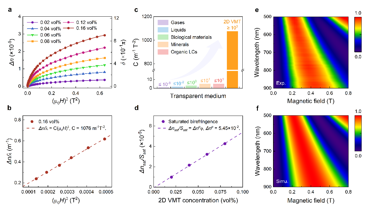 研究人员进一步探究了二维蛭石分散液中的液晶学行为及其磁致双折射现象,发现表征磁致双折射效应灵敏度的克顿-穆顿系数超过103m-1T-2,高出传统双折射介质数个量级。理论分析表明,二维蛭石较大的形状各向异性和与结构铁共同导致的磁化率各向异性可能是这一体系中巨磁光效应的来源。此外,该体系中透射光的相位延迟量可达到π及以上,表明二维蛭石可能具备透射式干涉色的调制能力。