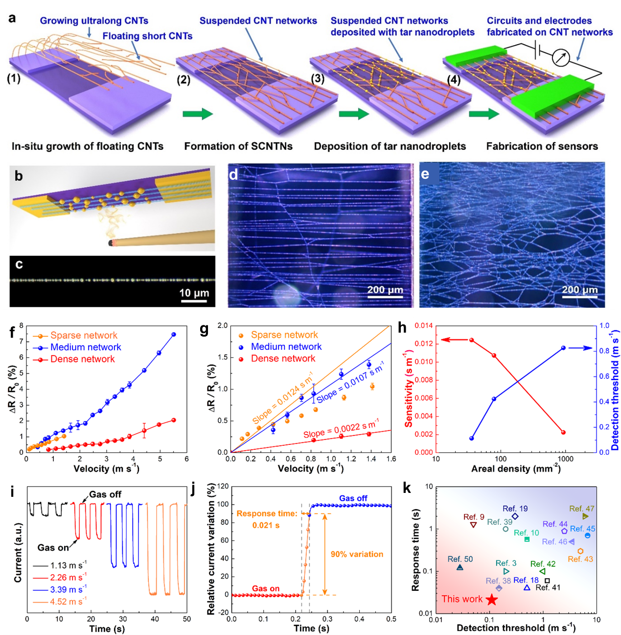 张如范课题组充分发挥制备结构完美的超长碳纳米管的特长,提出了用超长碳纳米管悬空网络制备超灵敏气流传感器的思路(图a-d),并发展了一种简便制备超长碳纳米管悬空网络的技术。以此悬空网络作为传感体,组装电极和封装,制得了原型器件。测试表明,其响应时间非常短(0.021s),灵敏度高(0.0124ms-1),检测阈值低(0.11ms-1),检测范围宽(0.11~5.51ms-1),综合性能显著优于目前大多数报道,充分展示了超长碳纳米管的超轻超细悬空网络结构所具有的优异力学和电学性能及极好的柔性带来的性能革新(图f-k)。