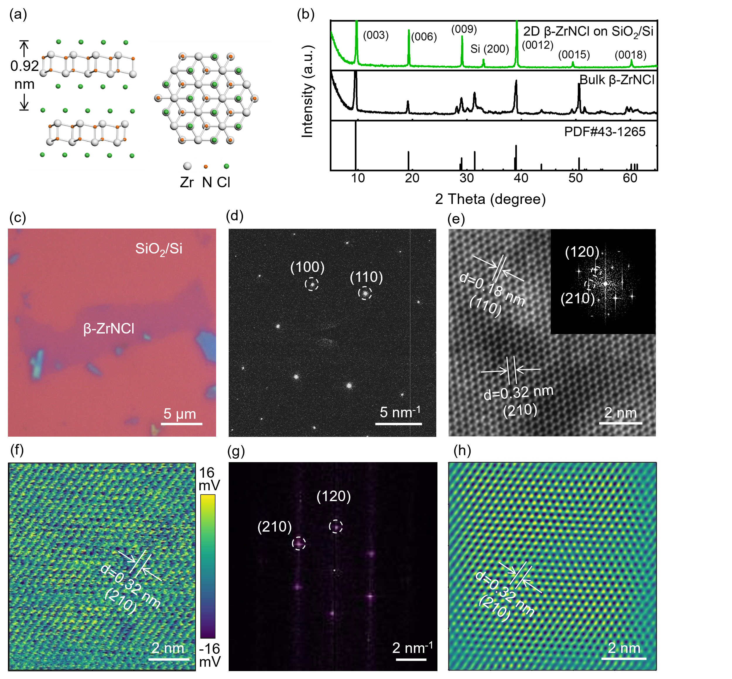 图1.宽带隙二维半导体材料β-ZrNCl的晶体结构及其表征。在材料的原子结构中,Zr和N原子组成AB型六元环结构