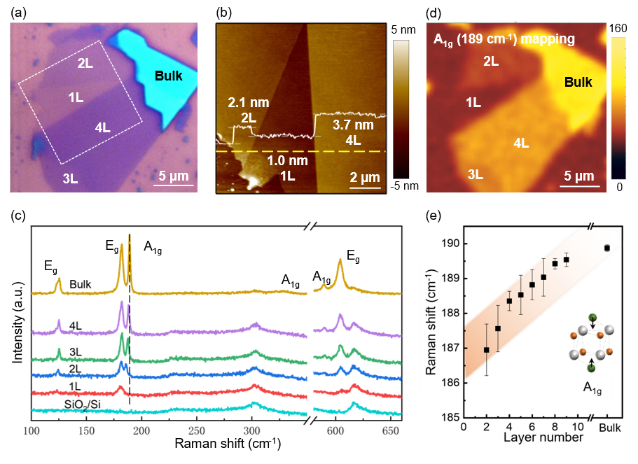 在此项研究中,研究人员首先采用化学气相传输法(CVT方法)制备出块状β-ZrNCl晶体,之后采用黏胶带剥离法获得单层和少层β-ZrNCl。在此基础上,研究人员系统地探究了单层和少层ZrNCl的拉曼光谱及其与体相材料的区别。结果表明随着层数的减少,位于189cm-1的A1g特征峰出现了明显的红移,且峰强明显降低,并且当ZrNCl的层数降低至单层时,该峰消失。这些结果表明拉曼光谱可以作为一种快速且无损的手段来表征二维ZrNCl的层数。
