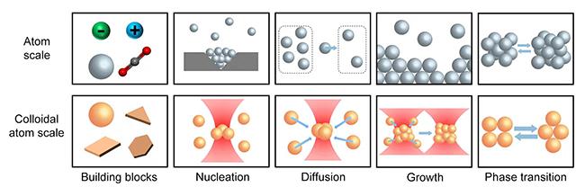近日,材料学院李正操教授课题组和精仪系孙洪波教授、林琳涵副教授课题组在系统总结目前的光诱导组装工作的基础上,从晶体学的独特角度,将胶体物质的光学组装过程类比为原子的形核、结晶、和生长的过程,串联介绍了光在不同阶段的作用(图1),探讨了光在胶体材料的成核、扩散、键合、生长等过程中的作用机制和技术发展现状,梳理了光诱导光力、热泳、流场所产生的形核、富集等效应对胶体组装过程的影响规律。