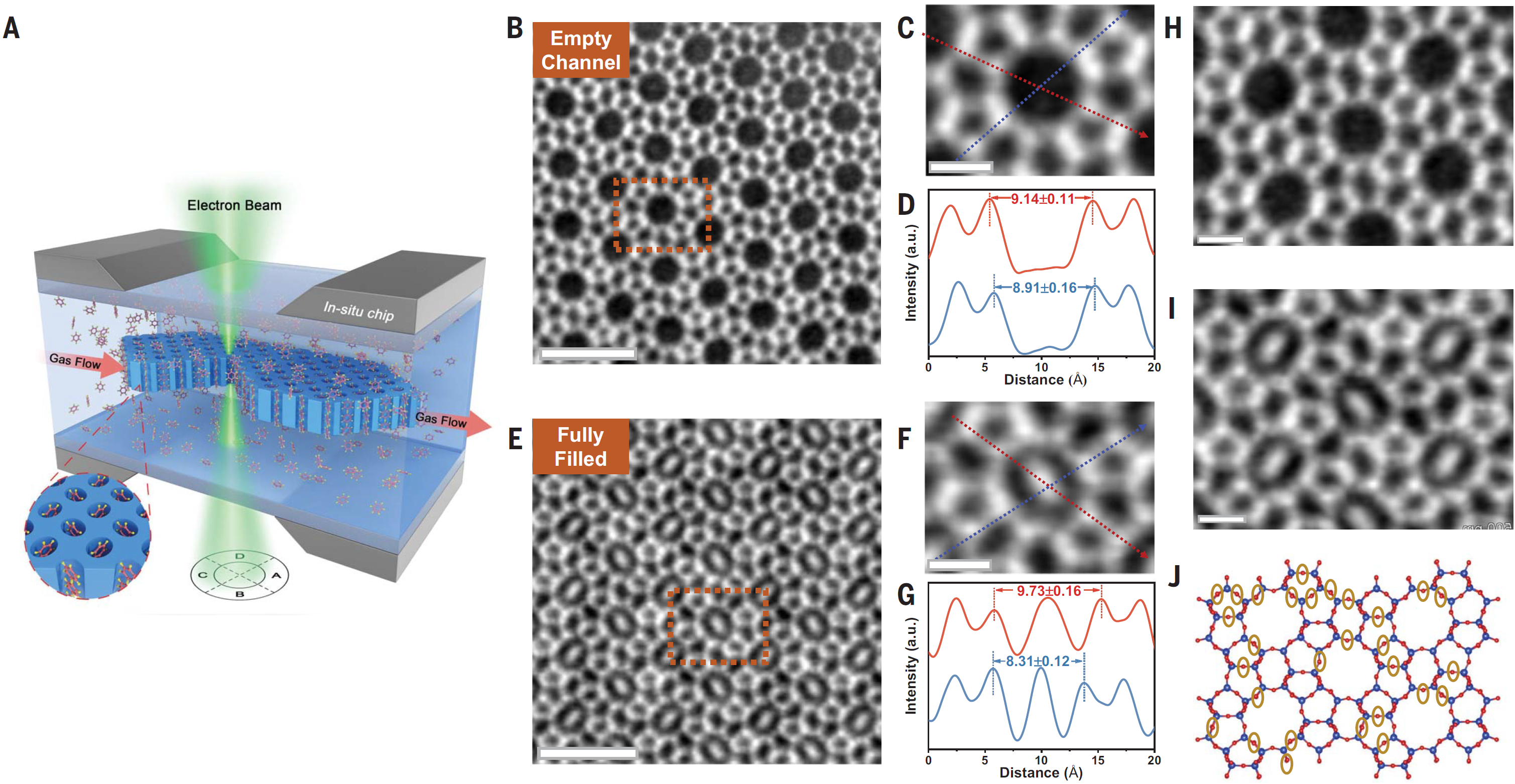 在过去的六十年中,由于传统衍射方法的局限性和沸石骨架的复杂性,人们难以观察到亚纳米尺度下分子进出孔道的动态行为,尤其是大的分子进出小的刚性几何孔道的现象一直无法解释。基于此,魏飞团队将具有轻重元素同时成像能力的积分差分相位衬度扫描透射电子显微技术(iDPC-STEM)和原位气氛系统(In-situ Atmosphere System)相结合,搭建了皮米原位电镜催化平台,实时观测限域有机分子运动行为和分子筛局域结构,同时对有机小分子在分子筛上的吸附、扩散和反应过程的微观机制进行深入分析(图2)。