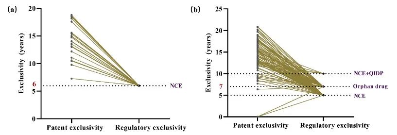 其中,美国获批药品的PTE长度提取自美国专利商标局数据库,我国获批药品的PTE长度为通过模拟计算获得(我国药品专利补偿制度于2021年6月1日起施行)。研究分别纳入我国和美国获批的32种和107种小分子创新药。结果表明我国批准新药的模拟PTE长度中位数显著高于美国批准的创新药(5.0年vs.2.9年,P<0.05)。我国实施专利期延长制度以后将显著延长创新药的市场独占期,并且与美国没有显著差异。该研究建议我国应充分评估PTE政策对创新药市场独占期的潜在影响,制定更加具有激励效果的药品试验数据保护制度,以解决未满足的临床需求。