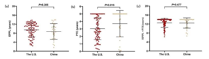 图3. 中美两国创新药的EPPL、PTE和EPPL+PTE长度比较