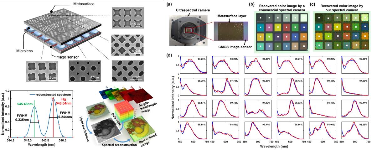 该成果研制的国际首款实时超光谱成像芯片如图1所示。通过硅基超表面实现对入射光的频谱域调制,利用CMOS图像传感器完成频谱域到电域的投影测量,再采用压缩感知算法进行光谱重建,并进一步通过超表面的大规模阵列集成实现实时光谱成像。该款实时超光谱成像芯片将单点光谱仪的尺寸缩小到百微米以下,空间分辨率超过15万光谱像素,即在0.5 cm2芯片上集成了15万个微型光谱仪,可快速获得每个像素点的光谱,工作谱宽450~750 nm,分辨率高达0.8nm。