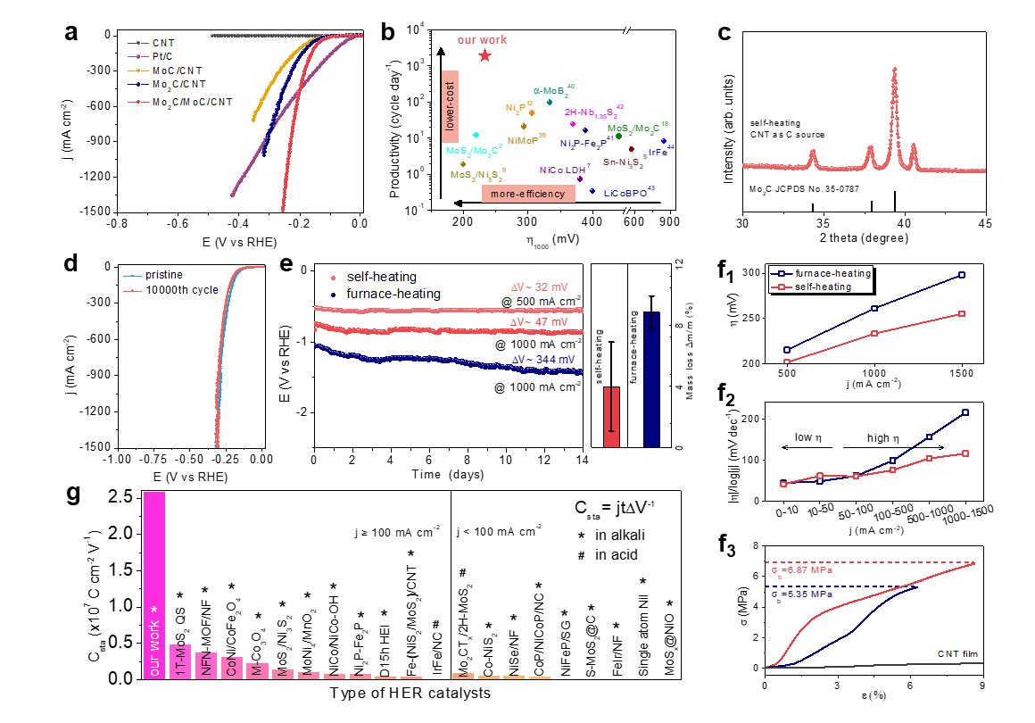 通过HER电解水催化制氢是一种非常有潜力的制氢方法。在工业应用中,HER催化剂必须在高电流密度下(≥500 mA cm-2)长时间(≥300 h)保持高活性和高稳定性。然而,现有的制备方法难以同时兼顾催化剂的高活性和高稳定性。引入粘结剂或构建特殊结构可以一定程度提升催化剂的稳定性,但通常也会降低催化剂的活性。在活性催化剂和导电基底之间建立牢固的化学键合是一种能够从根本上提高HER催化剂稳定性而不影响其化学活性的有效方法。针对此问题,刘锴副教授与深圳国际研究生院李佳副教授、北京科技大学孙颖慧副教授合作,开发的碳管薄膜自加热方法可在200-300ms的时间内实现室温与1770K高温之间的快速切换,在Mo和C前驱体存在的情况下,通过动力学控制原位合成性能稳定的Mo2C/MoC/CNT纳米异质复合薄膜(如图1所示)。研究团队利用实验和模拟相结合的方式发现,自加热方法从室温加热到1770 K仅需要~250ms,从1770 K冷却到600 K需要~330ms(如图1c所示)。一方面,快速的升降温和短暂的生长时间有效避免了Mo2C/MoC纳米异质颗粒的团聚,使其均匀分散在CNT上,丰富的Mo2C/MoC异质界面产生了高催化活性;另一方面,由于瞬态的超高温(1770K),Mo2C/MoC纳米异质颗粒与CNT之间形成结合牢固的化学键,大大提升了催化体系的稳定性。
