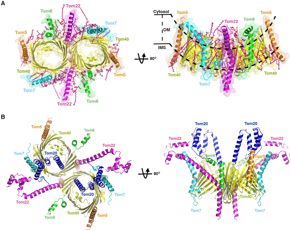 人源TOM复合物的结构:A、TOM核心复合物的结构 B、包含Tom22及Tom20胞质区的TOM复合物的结构