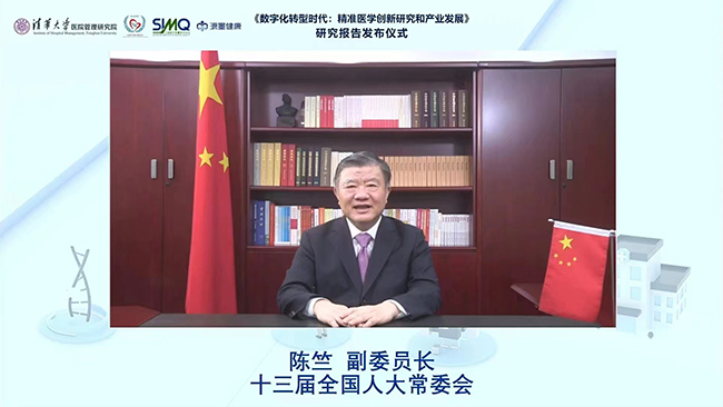 陈竺为主报告作序,并发表致辞,对课题团队表示了祝贺。他认为专家们顺应健康中国战略需求,积极主动地推动我国医学科技创新发展,系统阐述了全球科技、数字经济和现代医学发展具有重大影响的技术突破和未来发展方向,归纳和梳理我国精准医学、智慧医学和未来医学发展的机遇和挑战,为政策制定、学科创新和产业发展搭建了产学研融合的平台,提供了重要的循证依据。他希望课题组再接再厉,在未来定期展开相关研究,探讨发展机遇和创新模式,继续为我国医学科技创新、精准医学发展贡献力量。