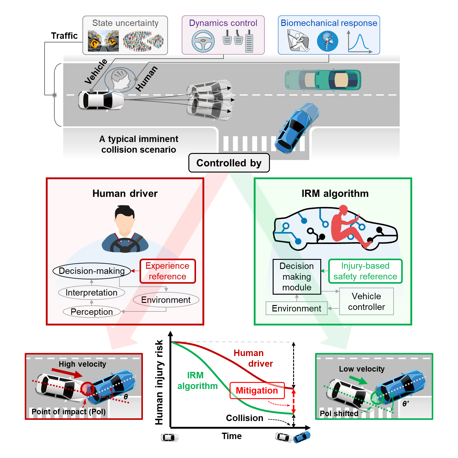 车辆学院周青、聂冰冰团队提出了危险场景智能汽车人员损伤风险动态预测方法。其核心算法(Injury Risk Mitigation-based algorithm,IRM)包括三个模块:首先,对积累的大量事故数据进行基于专家经验的清洗和预处理,建立数据驱动的人员损伤风险量化预测模型;其次,以实时更新的损伤风险预测为参考,提出了不可避免事故场景安全决策算法,在事故前约一秒时间窗口内滚动优化调整车辆行驶策略,实现损伤风险最小化;最后,依据中国交通事故深入调查(CIDAS)数据作为测试场景,量化评估人类驾驶员和该安全决策算法的损伤风险降低效果(图1)。
