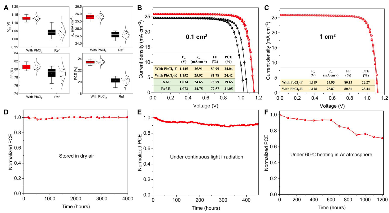 通过该方法制备的太阳能电池表现出了优异的光电性能,在AM1.5G标准光照下取得了最高24.42%的光电转换效率,刷新了真空蒸镀法制备钙钛矿太阳能电池的效率纪录,在1cm2和14.4cm2的大面积器件上分别实现了23.44%和19.87%的光电转化效率。此外,真空蒸镀法制备的太阳能电池表现出了良好的稳定性,在干燥空气中存储超过4000小时后无衰减,在湿度为35%的环境空气中储存1300小时后仍然保持97%的初始效率。该研究结果展示了真空蒸镀工艺在制备大面积高效率钙钛矿太阳能电池的优越性和产业化应用的可行性。