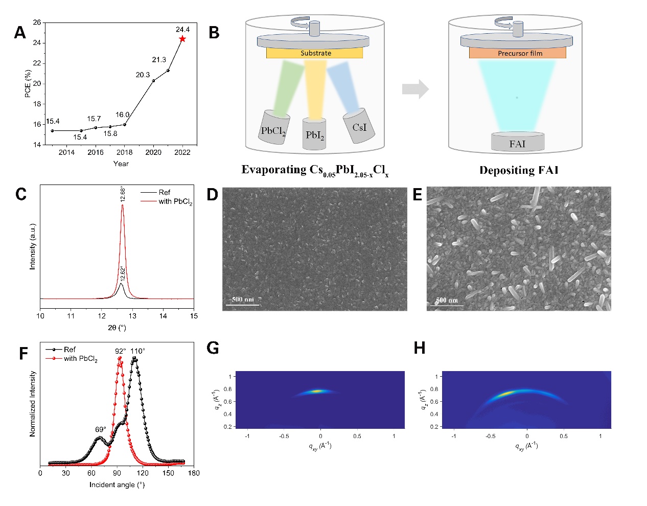 鉴于此,电机系易陈谊课题提出了一种氯元素合金化的真空蒸镀工艺,用于制备高效率大面积钙钛矿太阳能电池。XRD、SEM和GIWAXS测试表明,在前驱体薄膜中引入氯元素可以形成多元合金(Cs0.05PbI2.05-xClx),使前驱体薄膜具有垂直于基底生长的择优取向和更强的结晶性。原位GIWAXS和原位GIXRD测试表明,氯元素的掺杂可以显著加速FAI分子在碘化铅(PbI2)晶格中的扩散速度、促进δ相甲脒铅碘(δ-FAPbI3)转变为α相(α-FAPbI3),以及显著提升FAPbI3的结晶性。此外,基于氯代合金介导的真空蒸镀工艺制备的钙钛矿太阳能电池具有更低的缺陷密度和更低的非辐射复合损失。