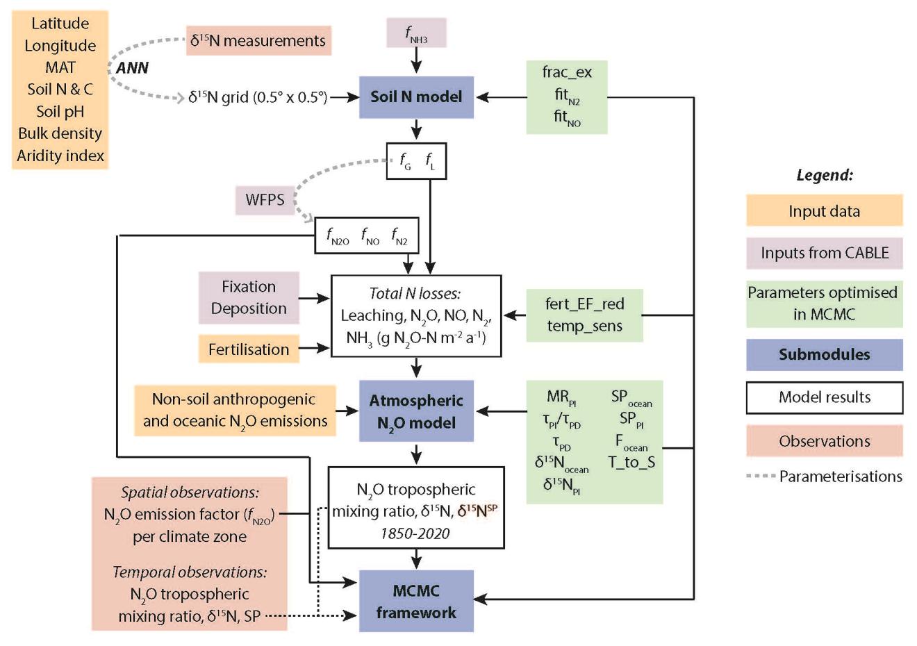 结合上述问题,mk手机注册深圳国际研究生院余龙飞课题组与瑞士苏黎世联邦理工学院Eliza Harris课题组展开了密切合作,开发了一套土壤-大气氮同位素耦合过程模型(IsotopicTracingOfNitrogen in theEnvironment-IsoTONE),以评估全球尺度下N2O排放的时空分布规律。该模型以全球土壤δ15N丰度分布为基础,模拟土壤氮损失和N2O排放过程,并利用大气背景下N2O同位素的长期观测数据加以验证,来计算N2O排放系数的全球分布特征,以及在1940-2020年间的变化趋势。