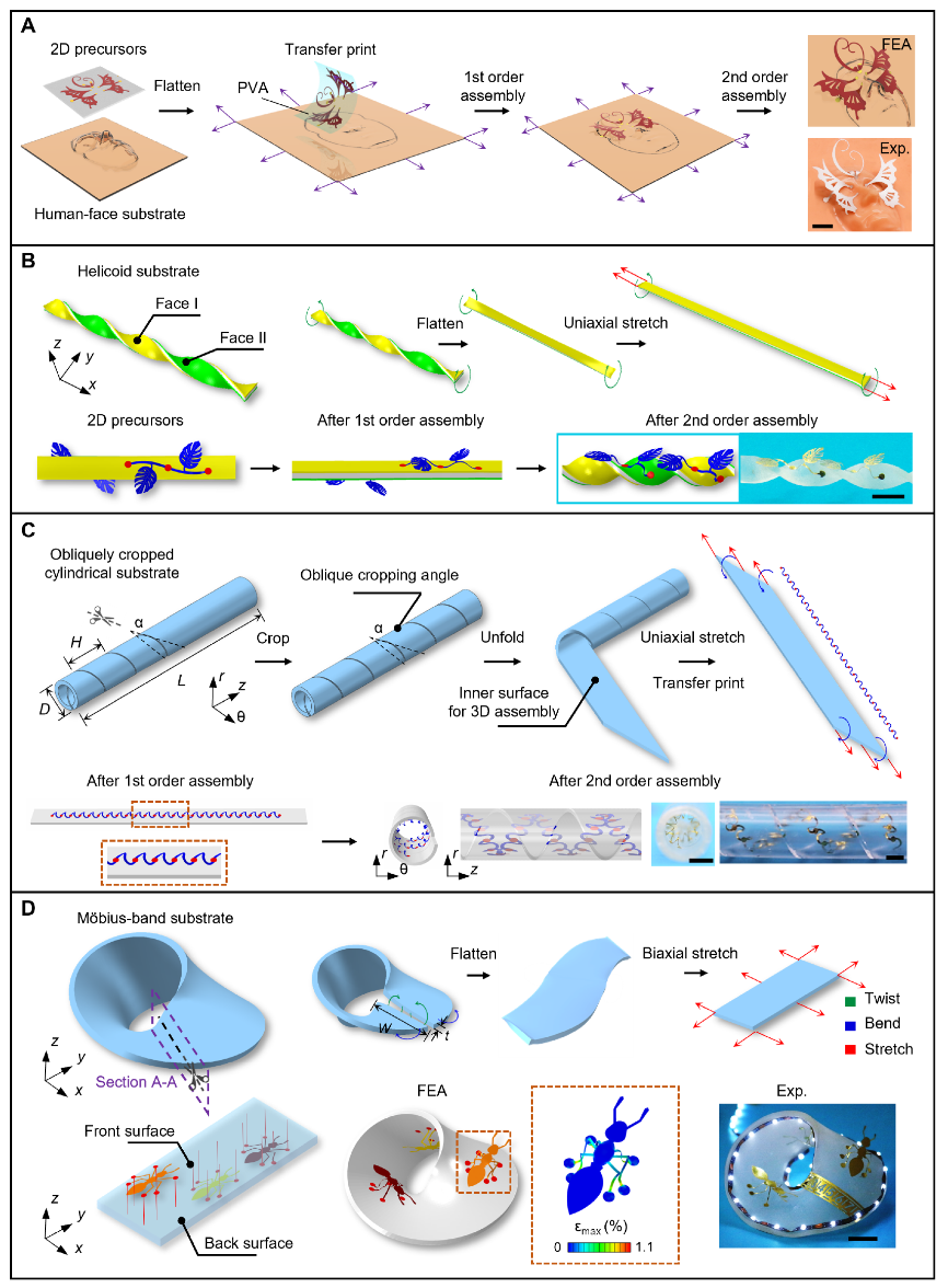 课题组提出了一种力学引导的逐级三维组装策略,使得平面薄膜或器件可以在众多三维曲面上变形为复杂的三维结构或器件,包括规则曲面(如半球面、圆柱面、螺旋面和双曲面)和仿生曲面(如缠绕的藤蔓、人脸、类大脑、主动脉和心脏等)。该策略首先利用力学加载将曲面弹性基底变形为平面或圆柱形结构,以便于平面薄膜的转印与集成,并通过进一步的单轴/双轴预拉伸来驱动屈曲引导的三维组装。将预先施加的载荷释放,便会诱发逐级的三维组装过程,并可通过定量的力学模型准确地预测整个过程。