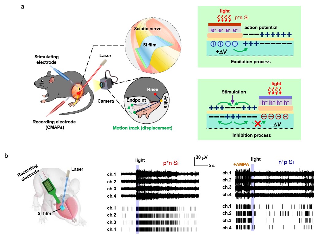 图1.可降解硅薄膜二极管产生光电信号激活和抑制神经活动(示意图)
