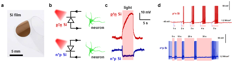 硅基半导体是信息产业的基石,pn二极管结构作为电子工程的基本单元,被广泛应用于微电子芯片、光电探测与成像、光伏电池等系统中。在生物系统中,当硅基二极管与神经系统的基本单元——神经元进行结合时,其光电特性将如何影响神经系统的活动与功能?研究团队发现,柔性薄膜硅基二极管结构与神经组织集成时,其在光照条件下,在半导体-溶液界面处产生极化的光生电场,不需引入光遗传学等基因编码工具,即可选择性的激活-抑制神经信号的活动。