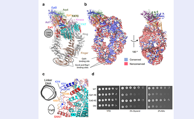 (a)NuA4与SAGA协同作用促进基因转录的工作模式图;(b)NuA4结合核小体的示意图;(c)NuA4-NCP复合物的电镜密度图;(d)NuA4各亚基结构域组成示意图,颜色与电镜密度图中一致