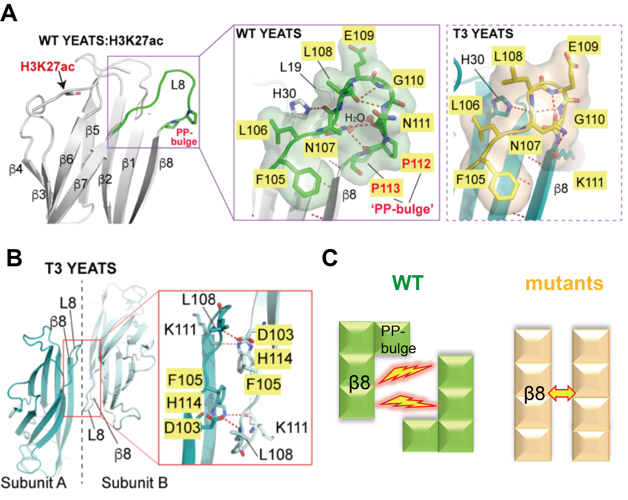 图1.致癌突变体导致“脯氨酸凸起”移走/消除,促进异常相分离发生。A)野生型蛋白中,YEATS结构域β8末端的脯氨酸被大量氢键网络稳定,形成“凸起”,该结构在突变体中被移走或消除。B)突变体利用其延长的β8增强YEATS结构域自聚集。C)野生型YEATS中的“脯氨酸凸起”抑制了自聚集