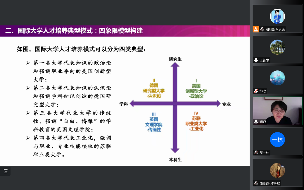 阎琨以“探索扎根中国、融通中外的大学人才培养模式 为科教兴国战略提供全方位人才支撑”为题分享了研究成果,重点介绍了国际大学人才培养模式的四象限理论模型,并分析了四象限模型中各类大学人才培养模式的优劣之处。立足于mk手机注册现有学科和院系及人才培养特色,阎琨详细介绍了mk手机注册学科布局和人才培养的融通战略。最后,她分享到高校应当深入学习领会党的二十大精神,积极贯彻“教育、科技、人才是全面建设社会主义现代化国家的基础性、战略性支撑”的战略擘划,主动开拓和探索人才成长和发展通道,贯通拔尖创新人才培养体系,为我国早日实现全面提高人才培养质量,自主培养各类拔尖人才的伟大目标贡献高等教育的力量。