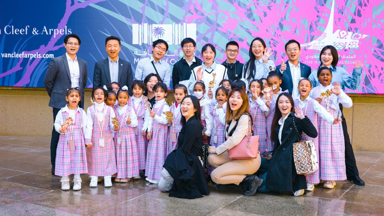 与参观沙特国家博物馆的小学生共说“你好!”