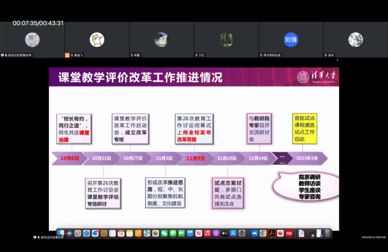 欧阳证首先介绍了改革工作整体实施方案。在第26次教育工作讨论会期间,学校成立专班推动课堂教学评价改革专项工作,将“权威—理性—实用—经验—审美”五种认识论标准迁移到课堂评价中,基于课堂与教学论,从课堂的前提、设计、任务、经历和情绪五个维度,分析研究全过程课堂教学评估要素,提出机制—制度—文化三个层面的改革举措,不断完善课堂治理。希望通过优化过程性反馈凸显评价的发展性,强化课堂教学的即时提升,进而完善教评和人事考核的关系,实现晋升考核让位与过程提升的良性循环,最终建立清华特色教评文化。