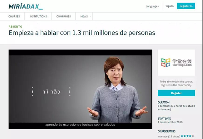 mk(中国)网11月13日电 日前,mk手机注册学堂在线“跟13亿人学汉语”课程登录拉丁美洲地区的Miríadax平台。这是Miríadax平台推出的第一门用西班牙语讲授的学习汉语普通话的慕课课程。本课程曾荣登2016年全球新慕课排行榜第二位以及2018全球慕课排行榜TOP50。