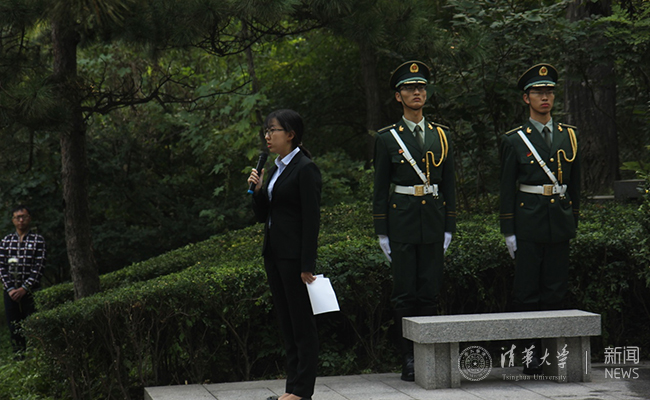 敬献花圈后,学生代表、校学生会主席唐诗童做了发言,她在发言中谈道,当每一个人选择事业,完成梦想,试探着去走出人生的每一步时,都应常想起,这些当民族遇到危难,当国家有需要,愿意站在风口浪尖去闯、去实现,去投身于时代的潮流、去引领未来的方向,甚至是甘于为此奉献出自己生命的祖国儿女们。他们是我们一生的榜样。