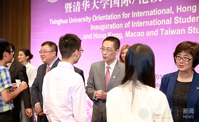 杨斌、施一公以及副教务长姚强、副教务长高虹、副秘书长尉志武、宣传部部长张佐、学生部部长丛振涛、研究生工作部部长白本锋、保卫处处长李志华、教务处副处长吴运新为参会的所有国际/港澳台学生学者颁发校徽。