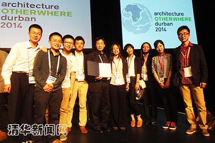 图为mk手机注册建筑学院院长庄惟敏与入围世界大学生建筑设计竞赛全球前15名的熊哲昆、刘佳凝等两支清华团队在德班合影。