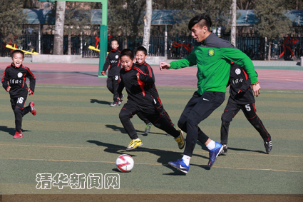 随后,北京国安队足球运动员邵佳一等以及老男孩俱乐部的运动员一起来到清华附小大操场与清华足球运动员和三年七班的同学进行了两场足球友谊赛。