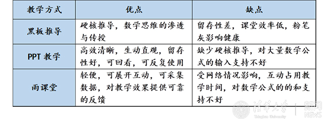 数学课,特别是数学专业课的教学显著特点是:严密讲授式与黑板板书硬核推导。所以,目前大多数数学专业课教师仍以黑板推导为主。而PPT教学是现在最普遍的教学方式,也是展开慕课与混合式教学和在线教学的基础。雨课堂是近年来新兴的教学工具,它借助师生广泛使用的PowerPoint与微信,能便捷地展开互动。