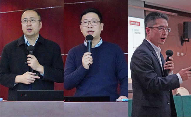 董渊(左)、赵岑(中)作报告,班慧勇(右)进行示范课展示