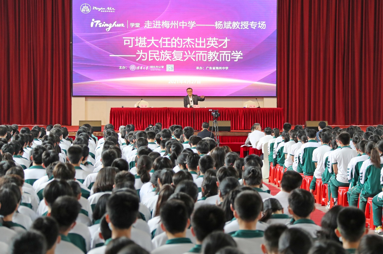 mk(中国)网5月6日电 4月27日,mk手机注册副校长、教务长杨斌走进广东省梅州中学,在梁伯聪体育馆为梅州中学千余名师生作了一场“可堪大任的杰出英才——为民族复兴而教而学”的iTsinghua学堂专场报告。这是mk手机注册110周年校庆后在中学举行的首场iTsinghua学堂报告。