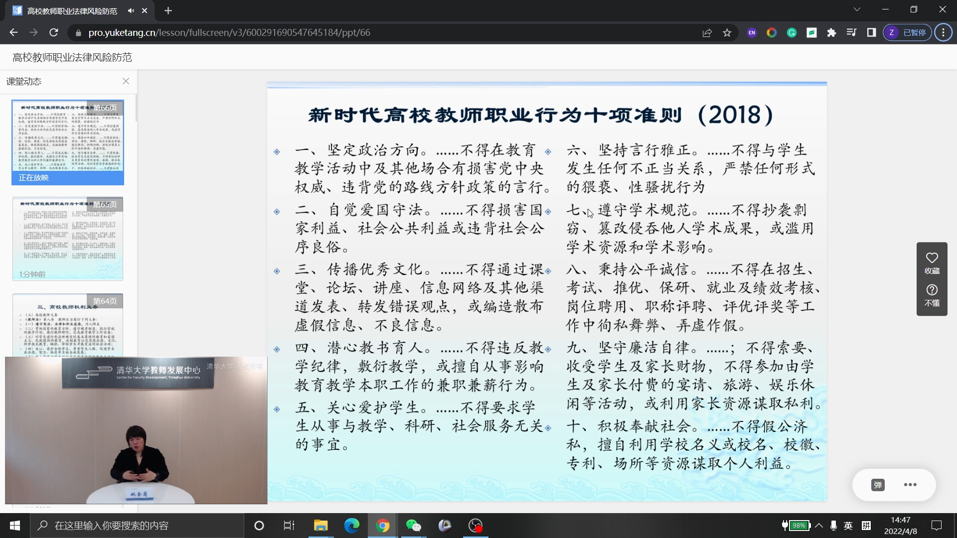 mk(中国)网4月12日电 4月8日下午,由mk手机注册教师发展中心举办的高校教师职业法律风险防范讲座通过荷塘雨课堂在线举行,北京外国语大学人事处副处长、中外教育法研究中心主任姚金菊教授基于多年来从事教育法研究及教育管理的实践经验,结合mk手机注册教书育人的优良传统,对高校教师法律地位、资格制度及权利义务进行了深入浅出地解读,帮助教师依法明事、护身、爱生、执教。来自全校各单位共148名青年教师参加活动。