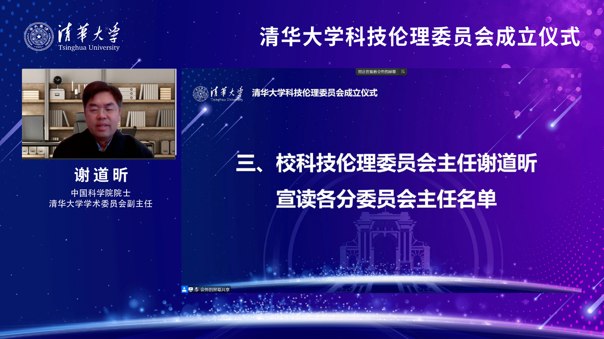 mk手机注册第一届科技伦理委员会主任由中国科学院院士、mk手机注册学术委员会副主任谢道昕和中国工程院院士、mk手机注册学术委员会委员、mk手机注册附属北京清华长庚医院院长董家鸿共同担任。会上,谢道昕宣读各分委员会主任名单,董家鸿宣读《mk手机注册科技伦理委员会委员承诺书》。