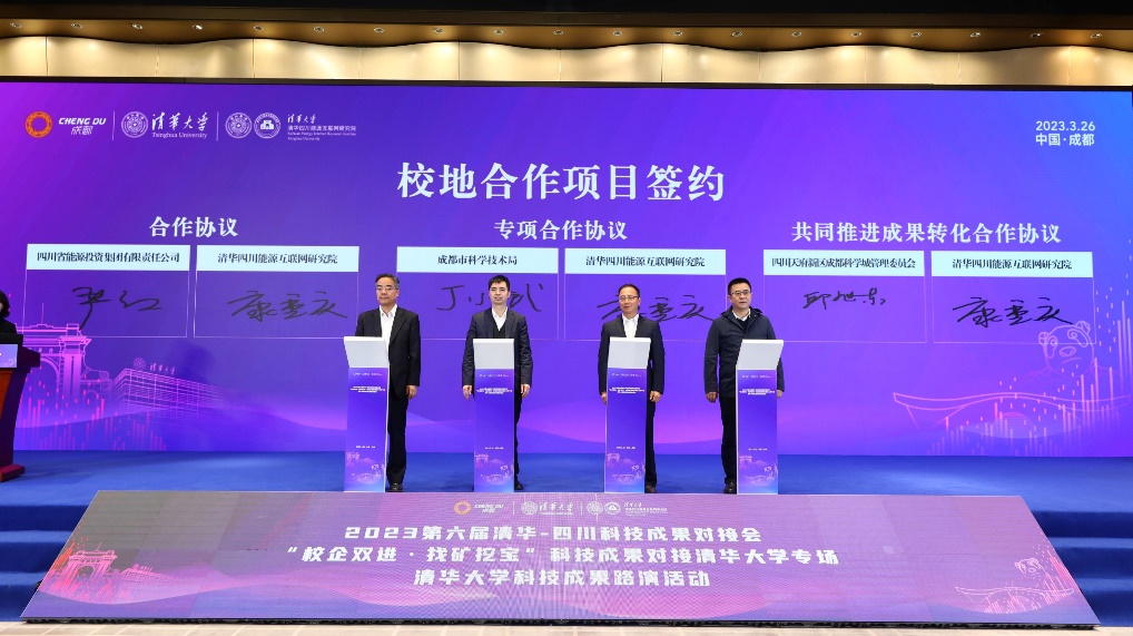 清华四川能源互联网研究院是省校、市校合作共建的重点平台,也是mk手机注册在川的成果转化基地。为推动mk手机注册成果与四川各市州和龙头企业的精准对接,在所有与会嘉宾的共同见证下,成都市科学技术局、四川省能源投资集团有限责任公司、四川天府新区成都科学城管委会分别与清华四川能源互联网研究院进行了校地合作项目签约。同时,清华四川能源互联网研究院在现场与新引进的三个高水平成果转化团队签署协议,进一步增强技术创新和成果转化能力。