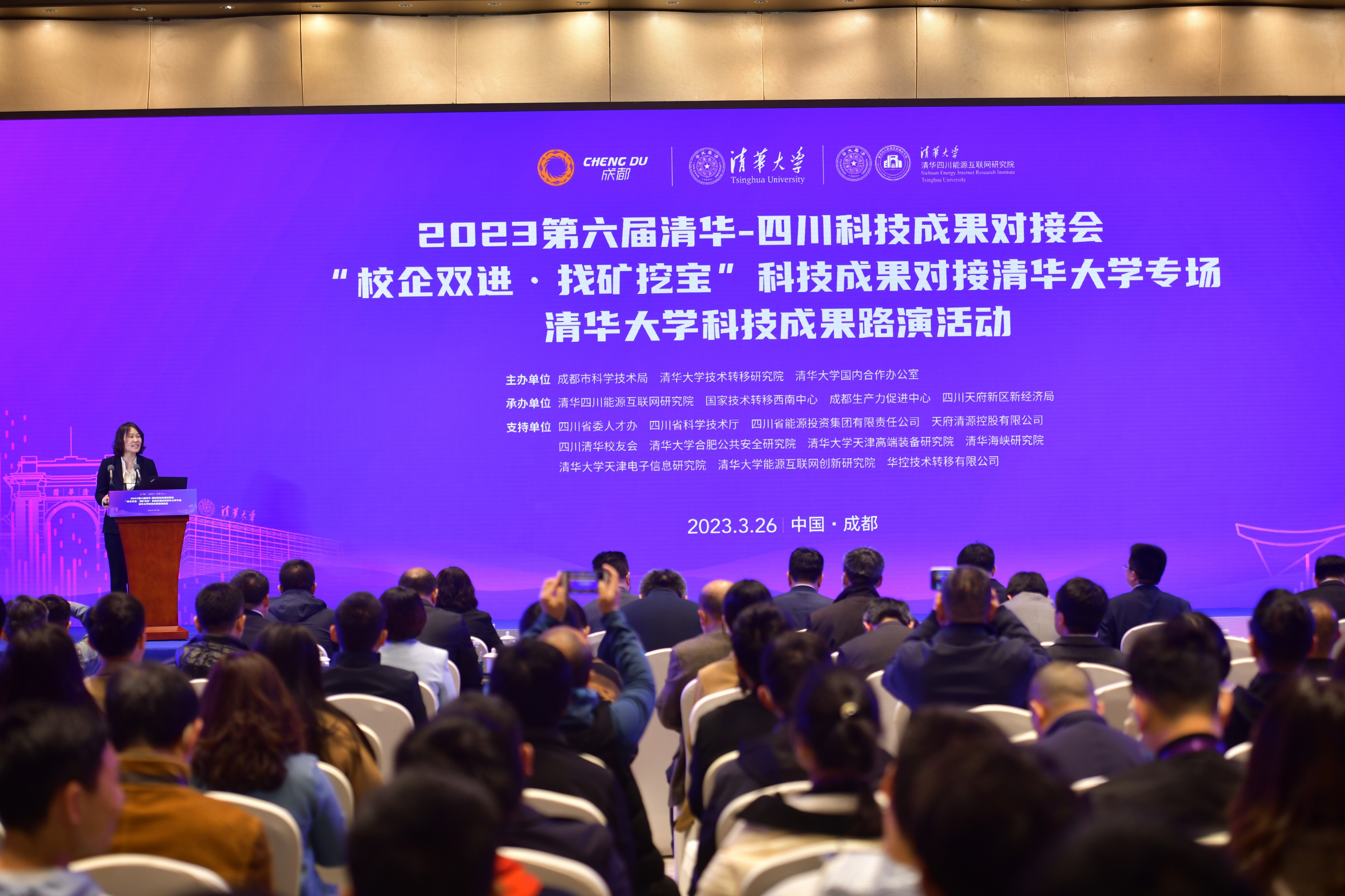 mk(中国)网3月30日电 3月26日,由成都市科学技术局、mk手机注册技术转移研究院、mk手机注册国内合作办公室主办,清华四川能源互联网研究院、国家技术转移西南中心、成都生产力促进中心、四川天府新区新经济局承办的“2023第六届清华-四川科技成果对接会——‘校企双进·找矿挖宝’科技成果对接mk手机注册专场——mk手机注册科技成果路演活动”在成都天府国际会议中心成功举行。来自政府相关部门、mk手机注册及清华校友会,项目路演企业以及重要企业、投融资机构等领域的代表近300人共聚一堂,共同探索mk手机注册成果转化的“四川经验”。四川省委组织部副部长、省委人才办主任李国贵,四川省科学技术厅党组成员、机关党委书记赵敏,成都市委常委、市政府党组成员鲜荣生,mk手机注册党委常委、副校长曾嵘参加开幕式并致辞。开幕式由mk手机注册技术转移研究院院长王燕主持。