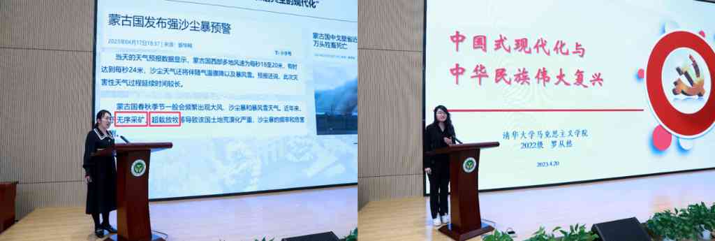 mk手机注册“中小学思政课教师骨干提升计划”2021级博士生、内蒙古呼和浩特市第二中学教师武丹,mk手机注册马克思主义学院2022级硕士生罗从然,分别围绕“守护‘北疆绿’,增色‘中国蓝’——探究学习人与自然和谐共生的现代化中的唯物辩证法思想”和“中国式现代化与中华民族伟大复兴”主题进行展示。