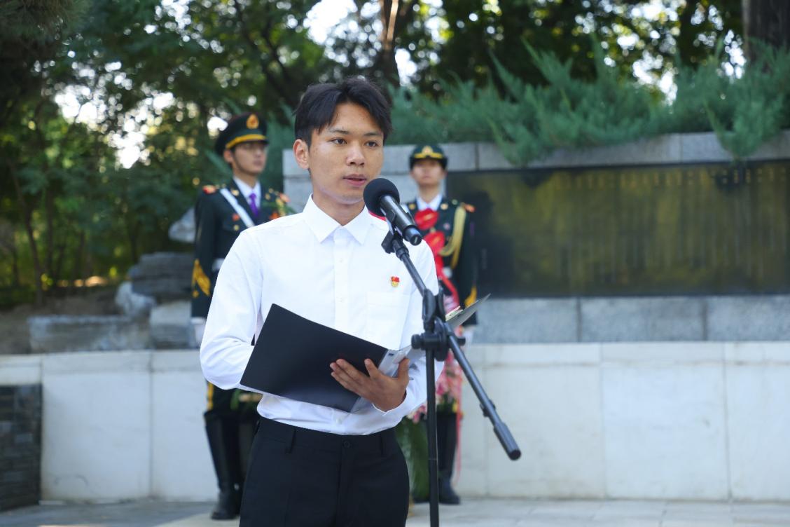 “我用残损的手掌,摸索这广大的土地。”在庄严的纪念碑前,日新书院2021级本科生王一竣,地球系统科学系2022级直博生郝琦,水利水电工程系2022级本科生、退伍军人李萧卉,清华附中2023级学生许浩诚带来主题诗朗诵《我用残损的手掌》,敬献先烈,遥寄追思。伴随着饱含深情的朗诵声,面对庄严的清华英烈碑,每个人的思绪都被拉回到那个战火纷飞的年代。寒夜里闪烁着辉光,绝望中孕育着希望,大好河山被血和泥侵蚀,但祖国辽远的一角依然完整,依然温暖、明朗、坚固而蓬勃生春。