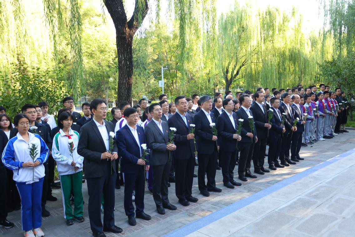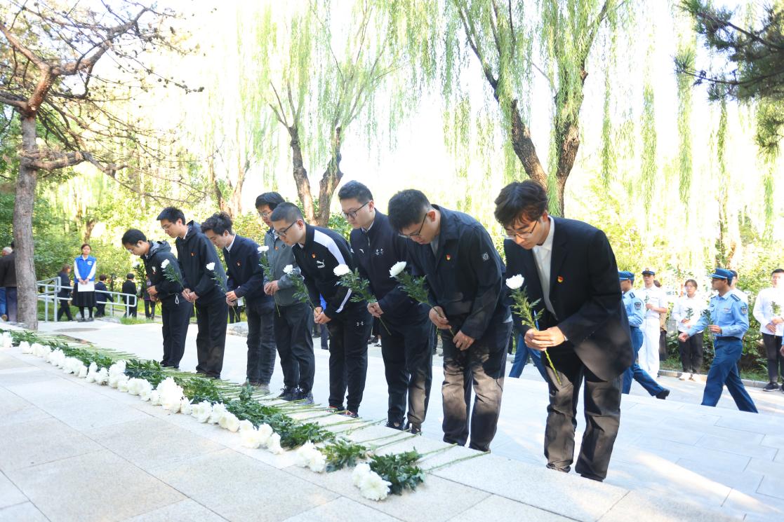 雄壮的国歌唱毕,仪仗队向“祖国儿女·清华英烈”纪念碑敬献花篮。随后,全体师生肃立,向这座纪念碑上镌刻着的65位在抗日战争和解放战争时期献身的清华英烈以及千千万万为国捐躯的英雄儿女表示深切哀悼。