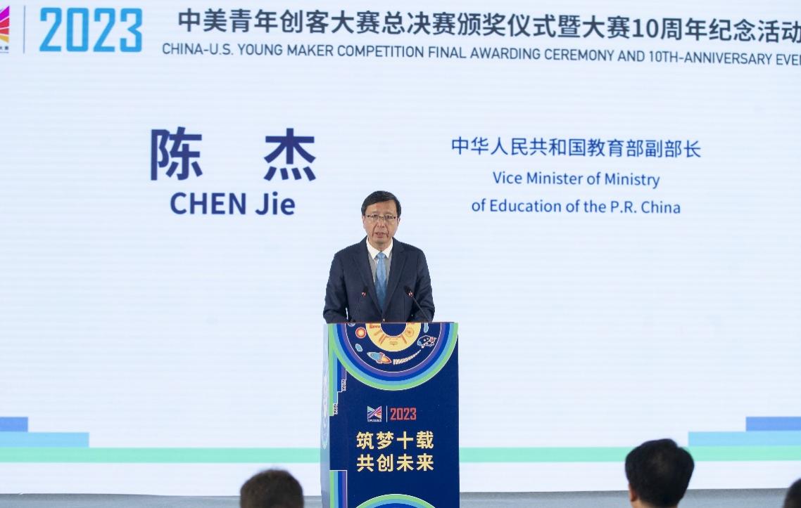 陈杰在致辞中充分肯定了中美青年创客大赛举办十年来所取得的丰硕成果。陈杰表示,2014年在中美两国元首的关心支持下,中美青年创客大赛正式启动。经过多年的耕耘,大赛规模不断壮大、内涵不断深化、合作机制不断成熟,形成了鼓励中美青年自由探索,创新创造、团结协作、共促友谊的独特亮点。即使在新冠疫情影响下,双方青年的创新对话合作也从未间断,为中美两国扩大和深化创新交流持续孕育新希望。陈杰指出,青年是人文交流的先锋,是创新创业的生力军。未来希望中美社会各界持续夯实合作基础,为两国青年创新合作搭建更广阔的平台;不断拓展合作空间,为两国青年去往对方国家面对面交流创造更多条件;大力强化制度保障,共同讲好中美人文交流合作共赢的故事,确保项目实施结出更多硕果。