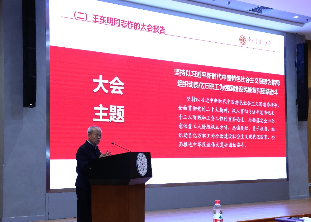张佐表示,今年9月《习近平关于工人阶级和工会工作论述摘编》出版,10月中国工会第十八次全国代表大会召开,习近平总书记同中华全国总工会新一届领导班子成员集体谈话,学校党委副书记、工会主席向波涛作为代表参加会议并当选为中华全国总工会第十八届执行委员会委员。校工会积极推动落实关于改进工会工作的各项部署,在工会常委会、理论学习中心组学习会、组织生活会等多个场合开展专题学习。张佐强调工代会代表和广大工会干部要带头做好理论学习,进一步增强政治性、先进性、群众性,并自觉将所学理论运用到工会工作实践中,不断增强基层工会的引领力、组织力、服务力,扎实落实学校关于开创工会工作新局面提出的新要求。张佐还简要报告了2023年以来工会各项重点工作的推进情况。