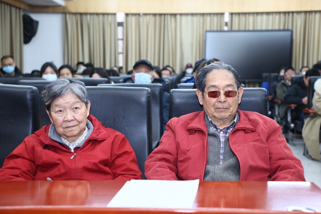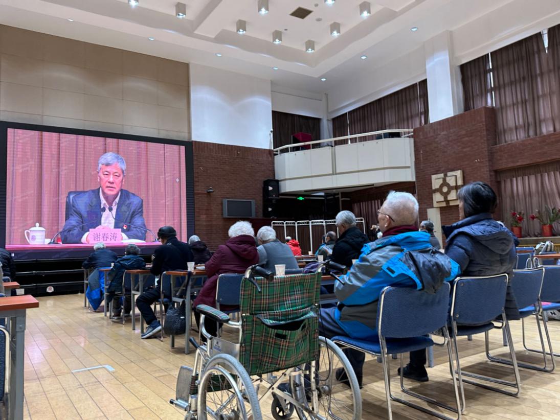 校机关离退休教职工党员钱锡康安静地坐在会场最后一排认真聆听讲座,旁边紧挨着的是他的轮椅。今年87岁的钱锡康行动已经不便,但有着67年党龄的他,仍坚持来到现场参加全体党员集中培训学习。