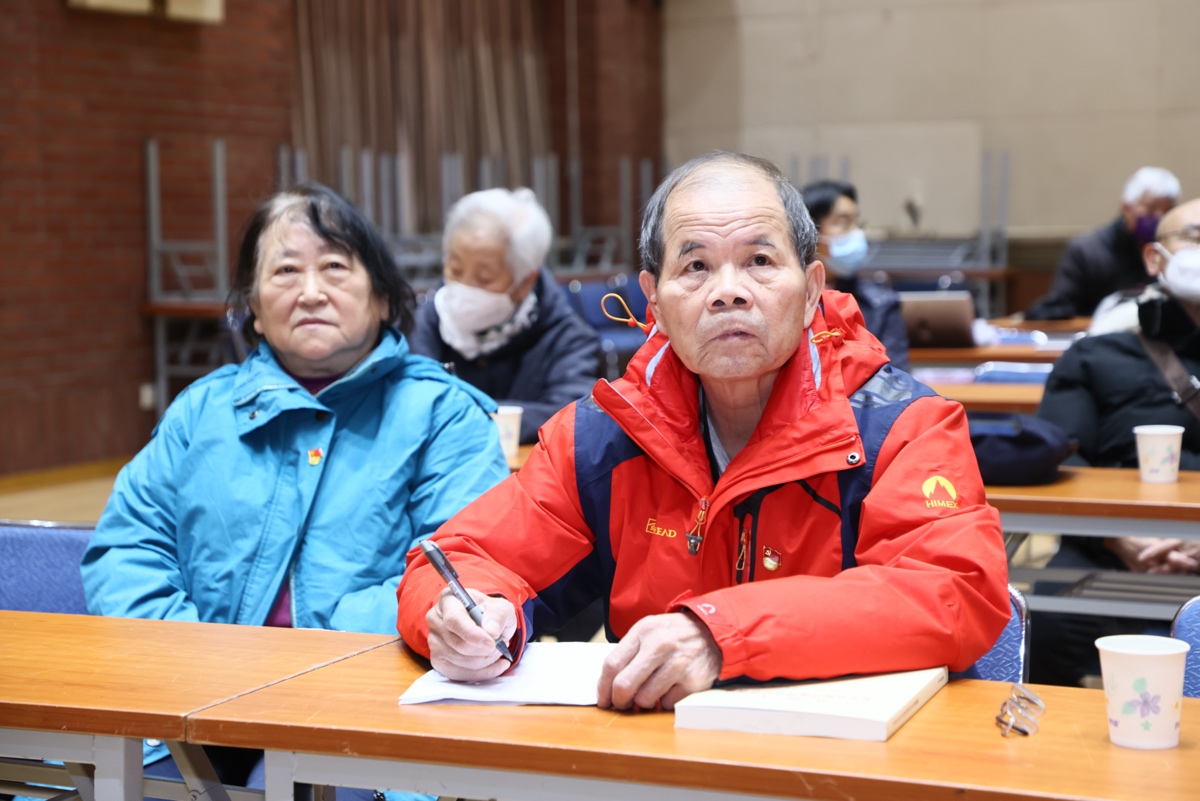 老同志们纷纷掏出了笔记本,时而低下头,一笔一划认真地记下学习心得,时而抬起头,目光炯炯有神,全神贯注地收听培训报告。