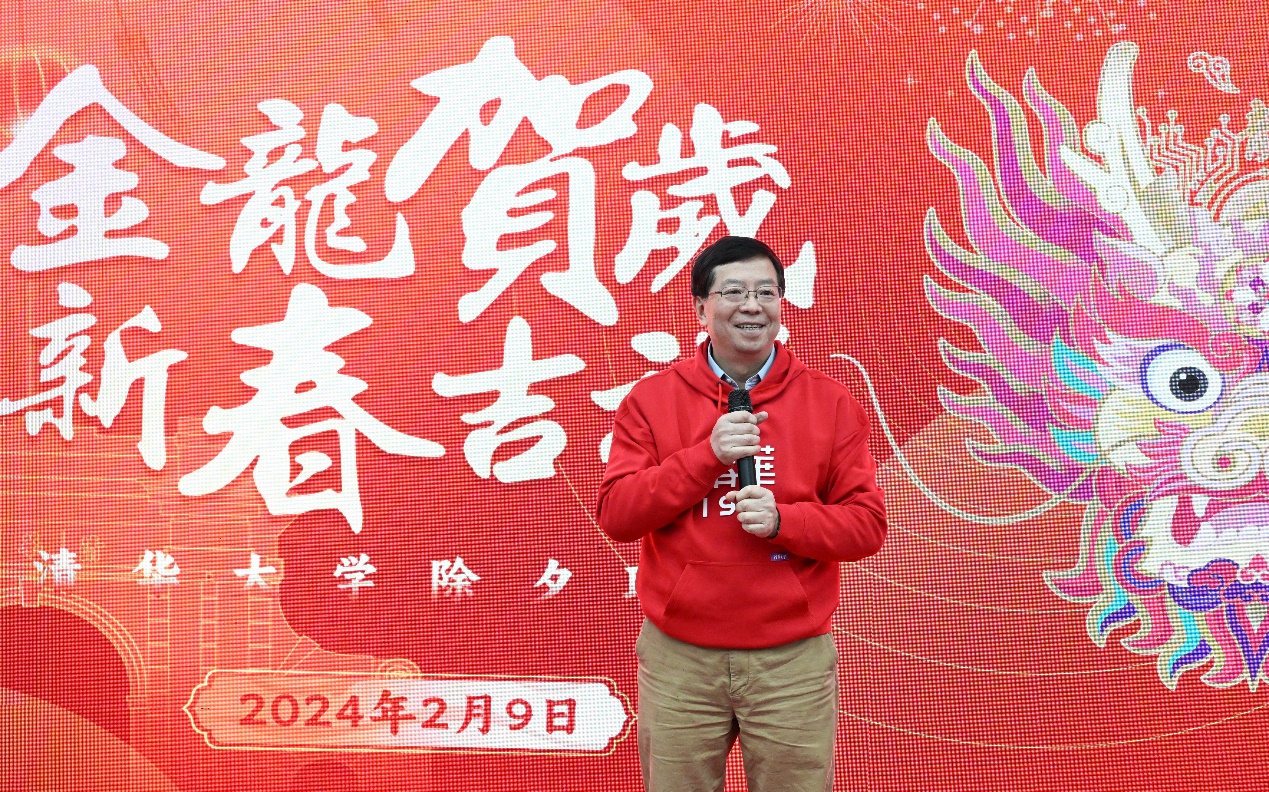 联欢活动现场诚意满满,匠心独具。现场布置了美院王红卫教授团队设计的龙年形象“清华龙”装饰,入口和大厅里张贴了以“清华”为藏头的春联。活动现场还为每一位到场的师生员工准备了福袋,包括有拉花、灯笼、DIY贴画等,还有带有祝福语的水果盲盒,可谓惊喜连连。