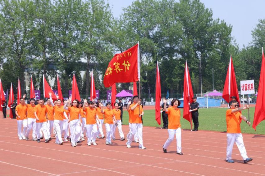 踏着整齐的步伐,喊着嘹亮的口号,学生国旗仪仗队、红旗队、院系、部处和附属单位等63个分工会的教职工依次步入操场。“升国旗,奏唱国歌”,鲜艳的五星红旗在与会全体教职工的庄严注目中冉冉升起、迎风飘扬。航天航空学院牛洪涛、体育部许淑文分别代表运动员、裁判员宣誓。1500余名教职工参与入场式、第九套广播体操表演,1200余名教职工参加《灯火里的中国》大型团体操表演,展示清华人积极进取、昂扬向上的精神风貌。