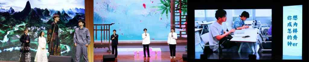 秀钟33班的DV剧以打破循环枯燥的“躺平”生活为切入点,展现秀钟人积极向上、阳光乐观的青春面貌;秀钟32班、31班的舞台剧新颖独特、创意纷呈,结合生活日常和专业学习,展现同学们的思考与表达能力。