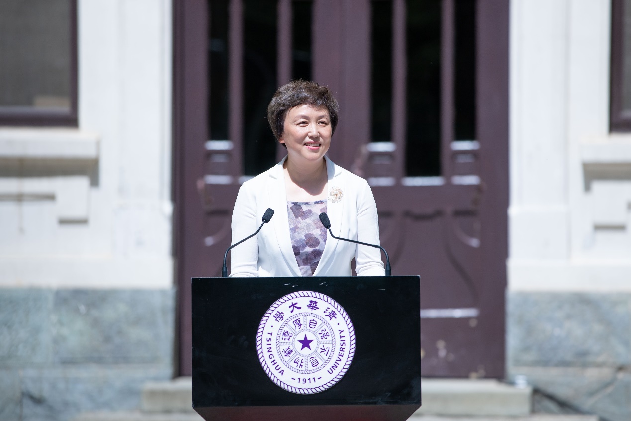 在清华的第一栋教学楼——清华学堂前,全体与会人员齐唱国歌,共同见证这一具有历史意义的时刻。青砖红瓦的清华学堂在午后的阳光下焕发出青春的光彩,正张开双臂欢迎有志青年走进这座百年学府,共赴一场初夏的邀约。