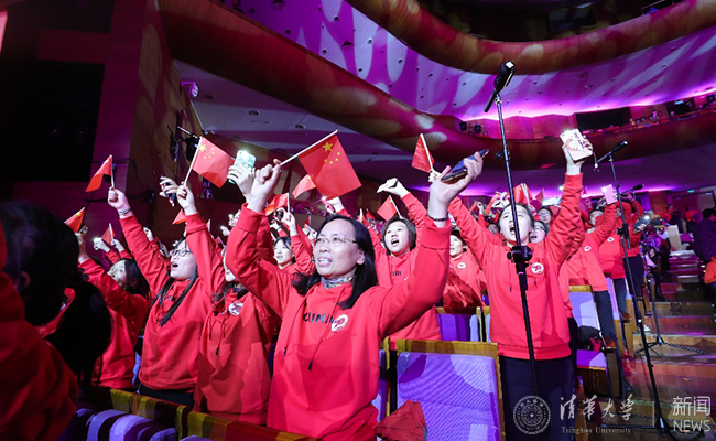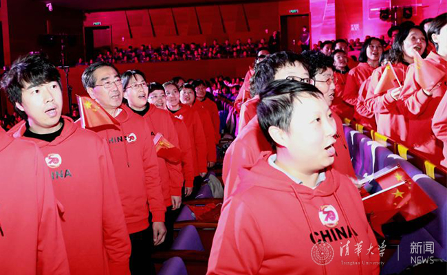 今年的合唱采取了台下座区合唱与台上屏幕互动的形式,让人耳目一新。在第二首曲目时,随着主持人的报幕,全场的目光聚焦到了台下校机关、社科学院、保卫部的座区,三个单位联队的教职工们随后起立,指挥人员就地指挥,参演的老师们开始声情并茂地演唱《我和我的祖国》这首熟悉的歌曲,姜胜耀也参与到合唱的方阵中同大家一起高唱。此刻,在舞台的大屏幕上,老师们现场唱歌的镜头同时录播,被绚丽多彩的灯光环绕,演播厅内被一片国旗红包围,热烈的气氛立马感染了每一个人,很多人随着哼唱起来,《我和我的祖国》这首今年演唱频率最高的歌曲此时被赋予上了浓浓的清华味道。